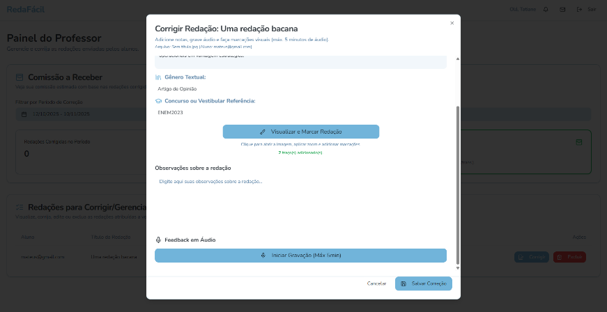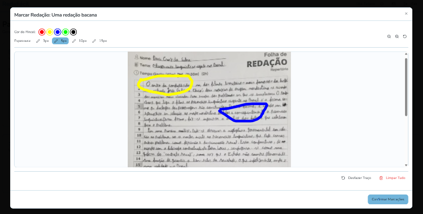 2. Correção Gráfica: O professor utiliza uma interface gráfica intuitiva para fazer marcações e anotações diretamente sobre a imagem da redação, como faria presencialmente.